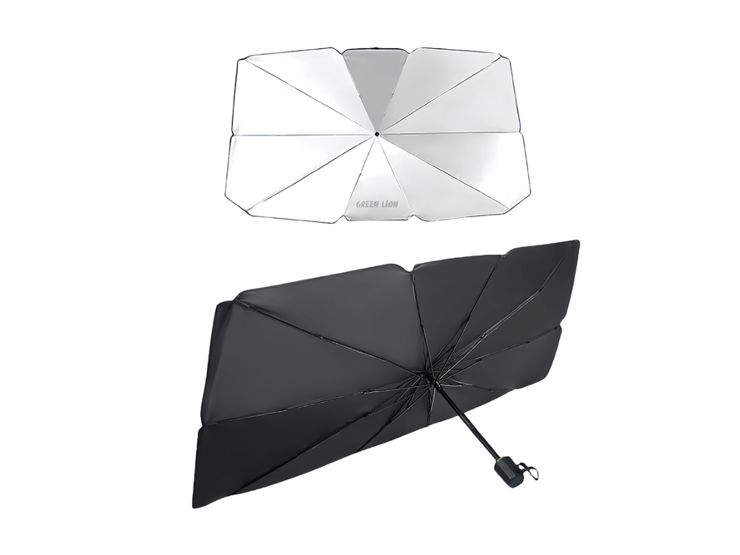 Keep your vehicle cool and protected from the harsh sun with the Green Lion Car Windshield Umbrella – Black. This innovative sunshade features an umbrella‑style design that easily opens to cover your windshield, blocking sunlight and harmful UV rays to reduce interior heat buildup and protect your dashboard, seats, and electronics.